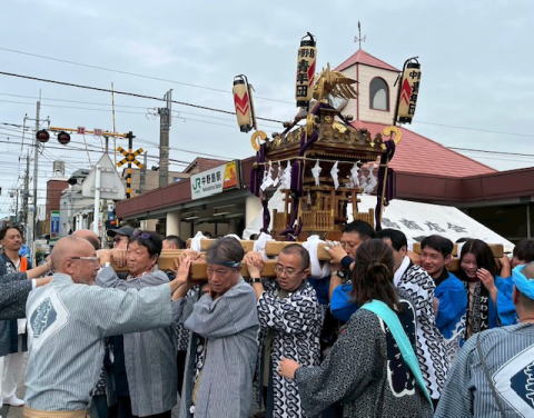商店会では、中野島駅前を提灯で飾り、御神輿渡御のお手伝いをしています担ぎ手の皆さんに振舞います。