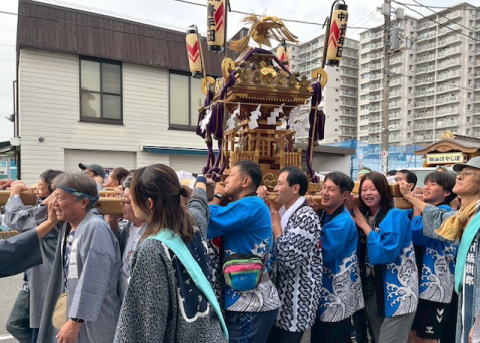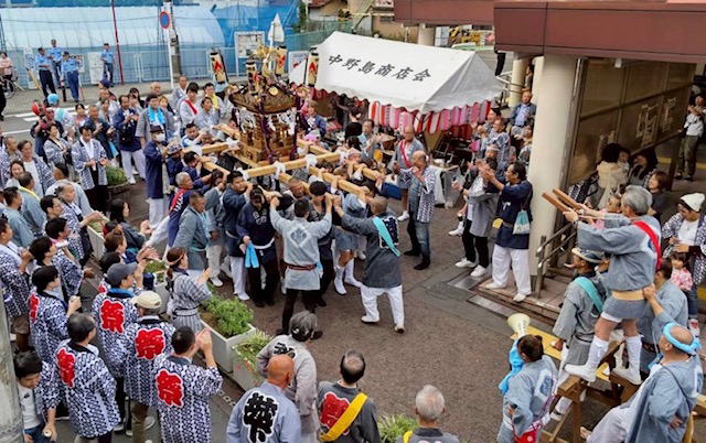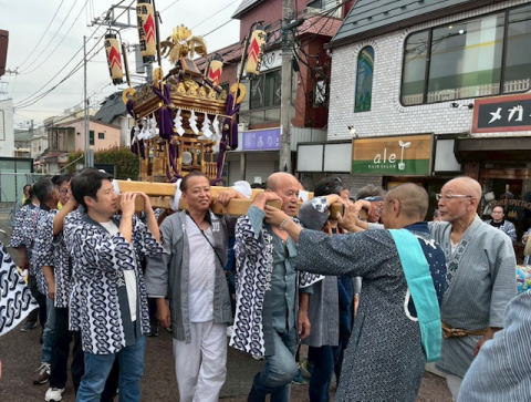 商店会では、中野島駅前を提灯で飾り、御神輿渡御のお手伝いをしています担ぎ手の皆さんに振舞います。
